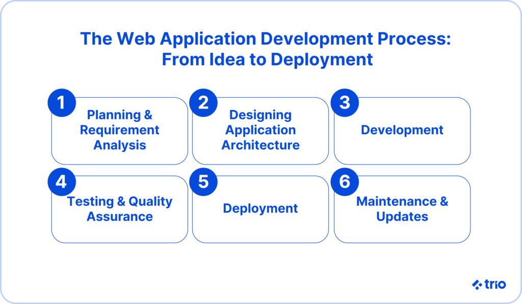 The process of creating your web app can be rather complex. If you are not already familiar with it, we’d recommend that you make use of a company like Trio to ensure that you do not miss any important steps that will affect speed and cost at a later date. Here’s a brief walkthrough of what you can expect, though.